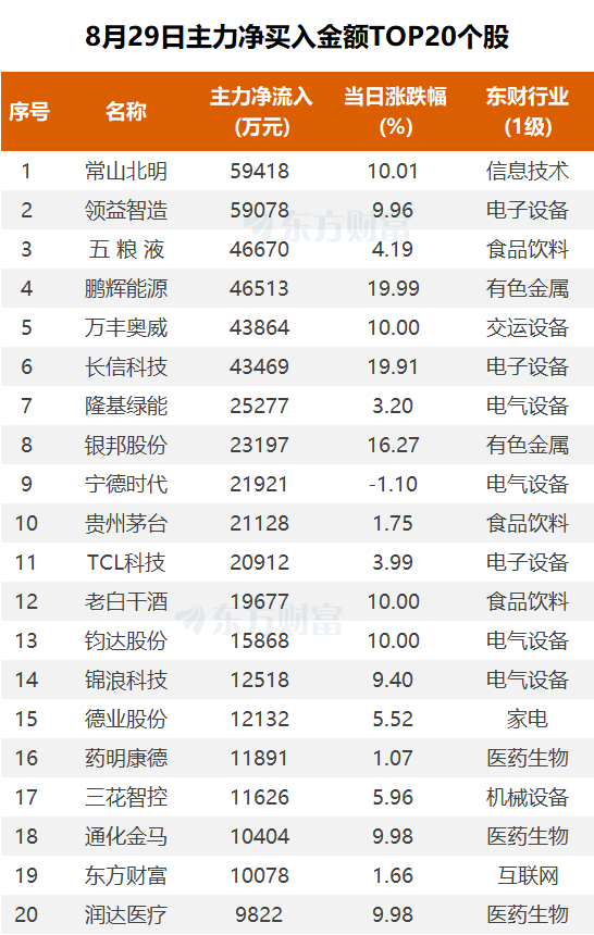 东方财富Choice数据显示,8月29日主力净买入前20大个股中,常山北明排名第一,主力净买入5.94亿元,该股今日涨停;领益智造排名第二,主力净买入5.91亿元。