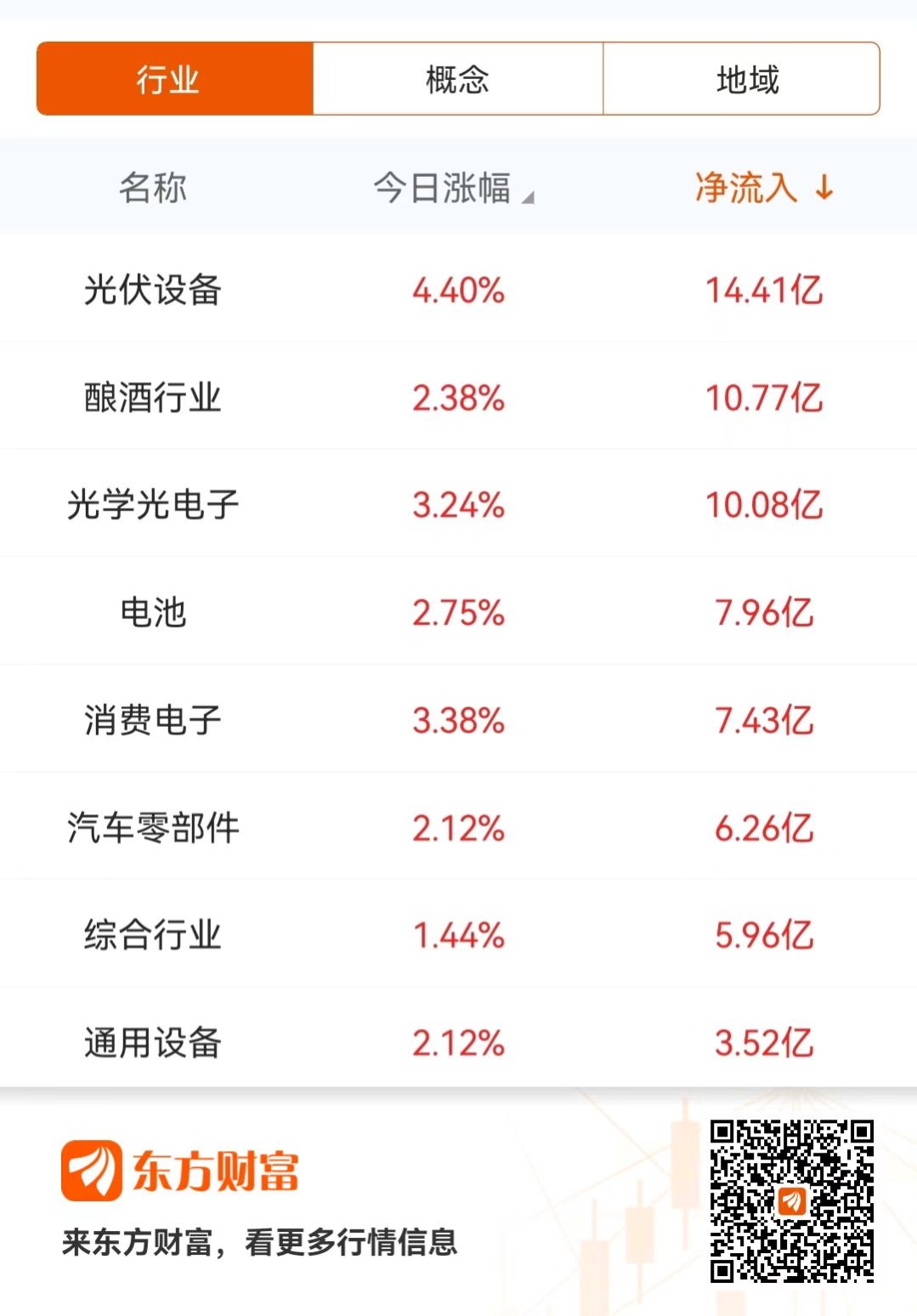 今日光伏设备、酿酒等板块主力净流入,其中光伏设备净流入14.41亿元。