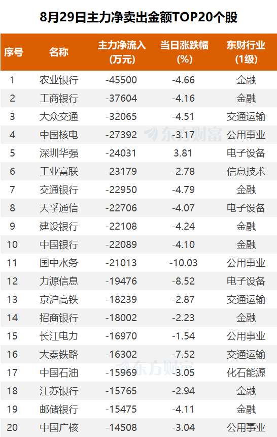 东方财富Choice数据显示,8月29日主力净卖出前20大个股中,农业银行排名第一,主力净卖出4.55亿元;工商银行排名第二,主力净卖出3.76亿元。